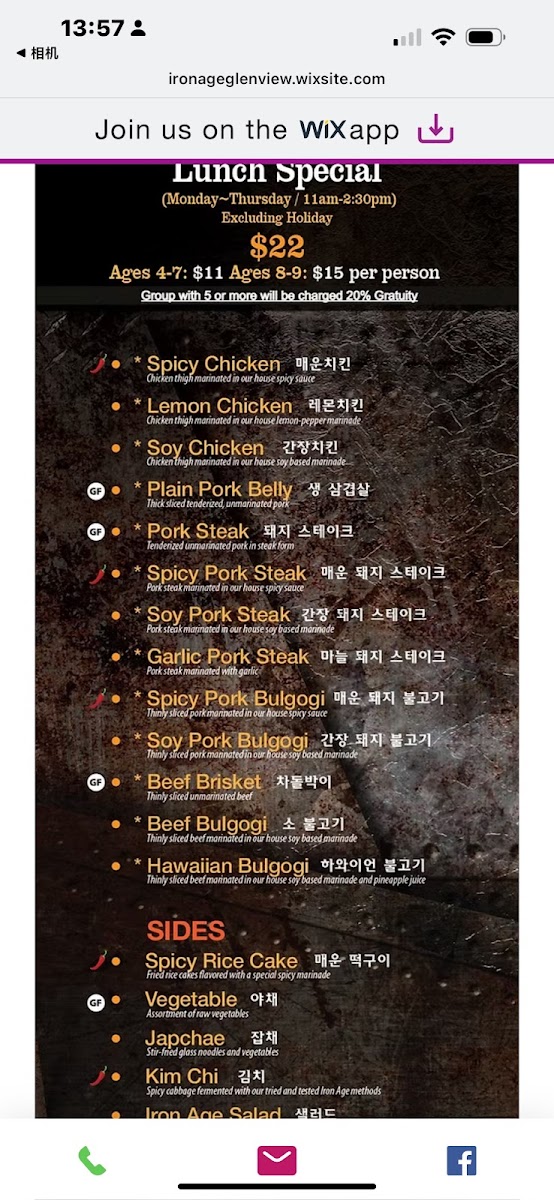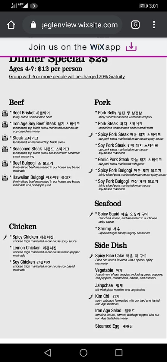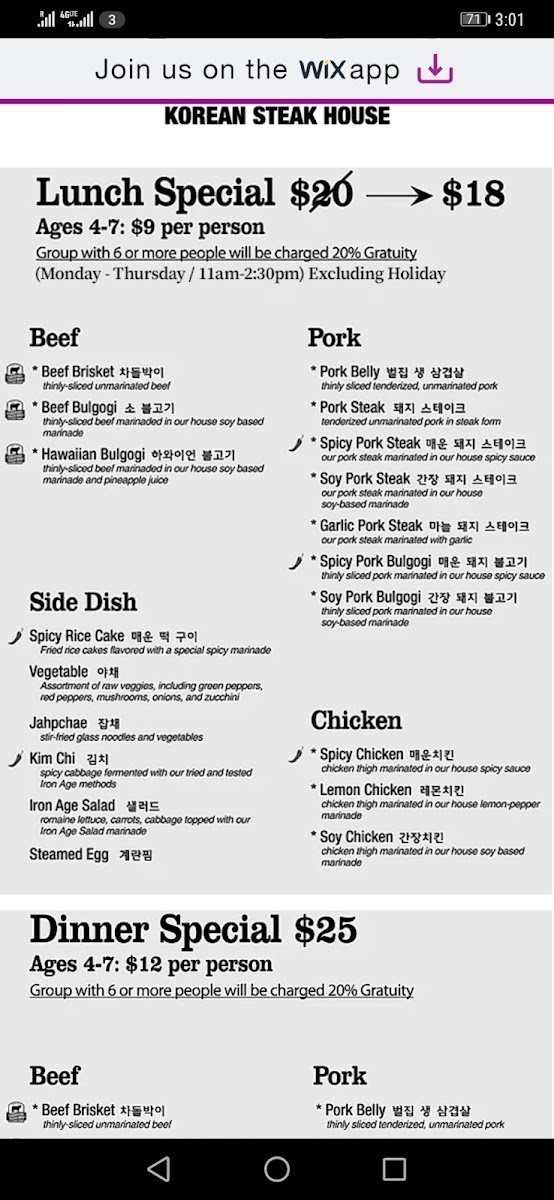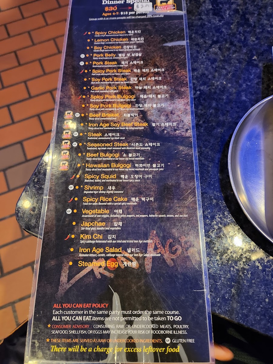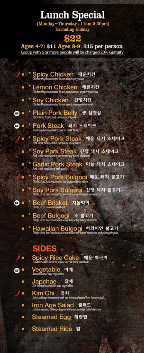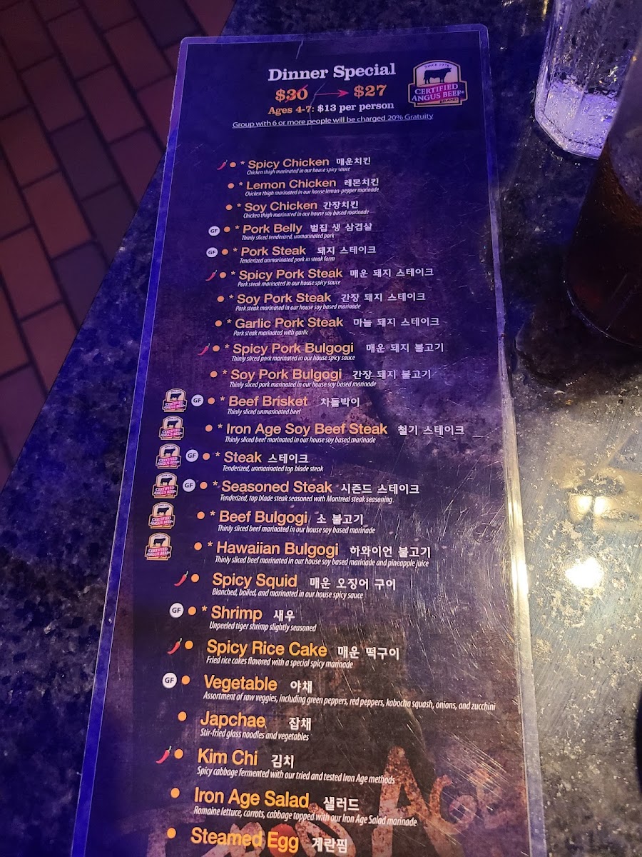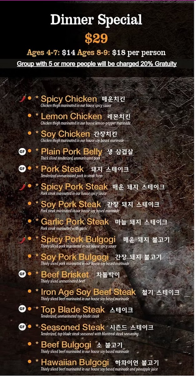 The menu at Iron Age Glenview features a variety of Korean cuisine centered primarily on traditional and marinated meats, along with complementary side dishes and beverages. Guests can select from several categories of meat including pork, beef, and chicken, each prepared with specific cuts and marinades to suit Korean barbecue dining.